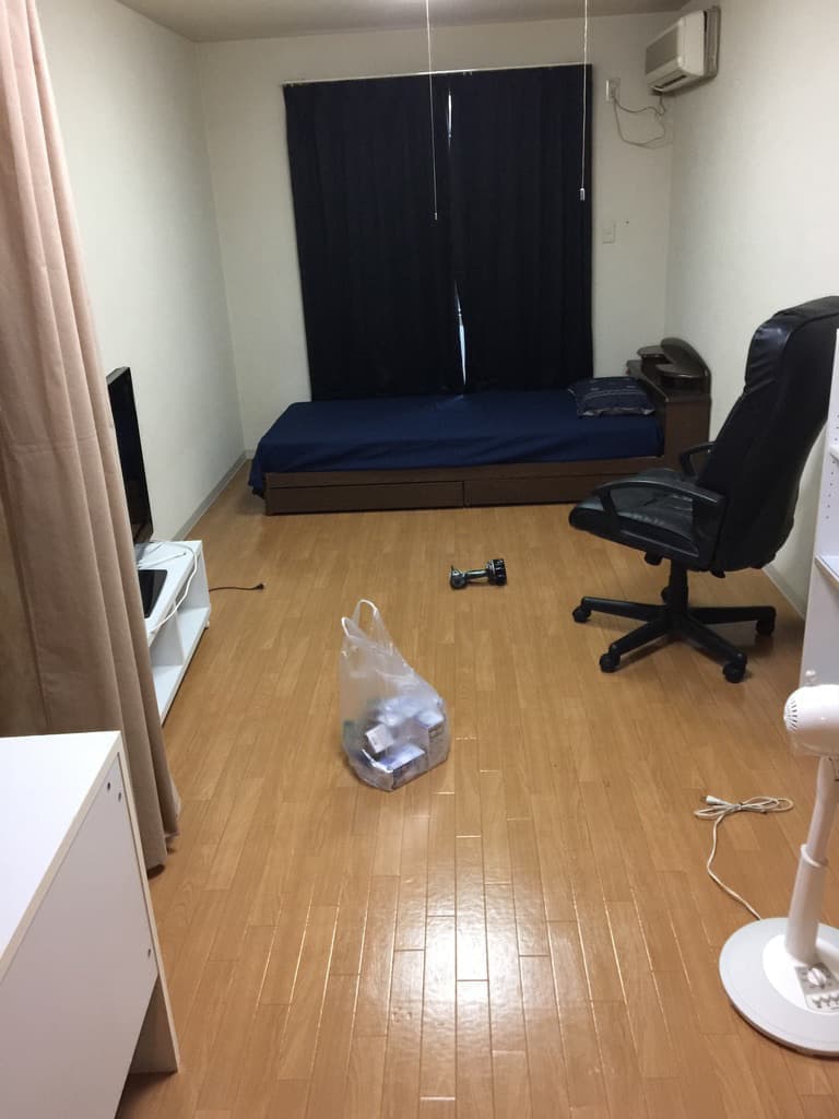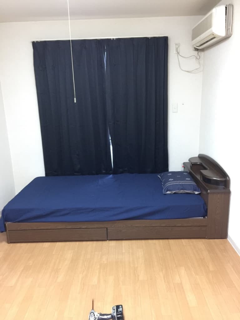 低いローベットをよういしています、この部屋は実験でプロジェクターを展示しようと計画したので100インチのスクーリーンも買っています、又、カーテンは、暗幕になっています、プロジェクター用の台も購入しているので楽しめます。この部屋は6メートルもあるのでさすがの10.5帖です。